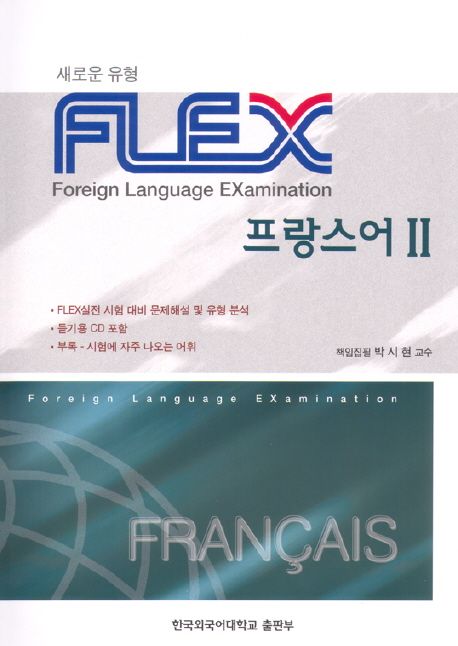 FLEX(Foreign Language Examination)란 외국어능력시험을 말하며, 우리 실정에 맞는 외국어능력시험 개발에 앞장서 온 한국외국어대학교가 대한상공회의소와 공동으로 시행하는 외국어능력을 검증하는 최고의 공인된 시험제도이다. 이번에 발행하는 FLEX 프랑스어 2는 FLEX 프랑스어 시험을 준비하는 이들에게 길잡이가 되도록 시험(듣기, 읽기, 말하기, 쓰기) 안내, 시험유형 분석과 해설 그리고 실전문제 등으로 엮었으며 시험에서 고득점을 취득하는 지침서가 될 것으로 확신한다.