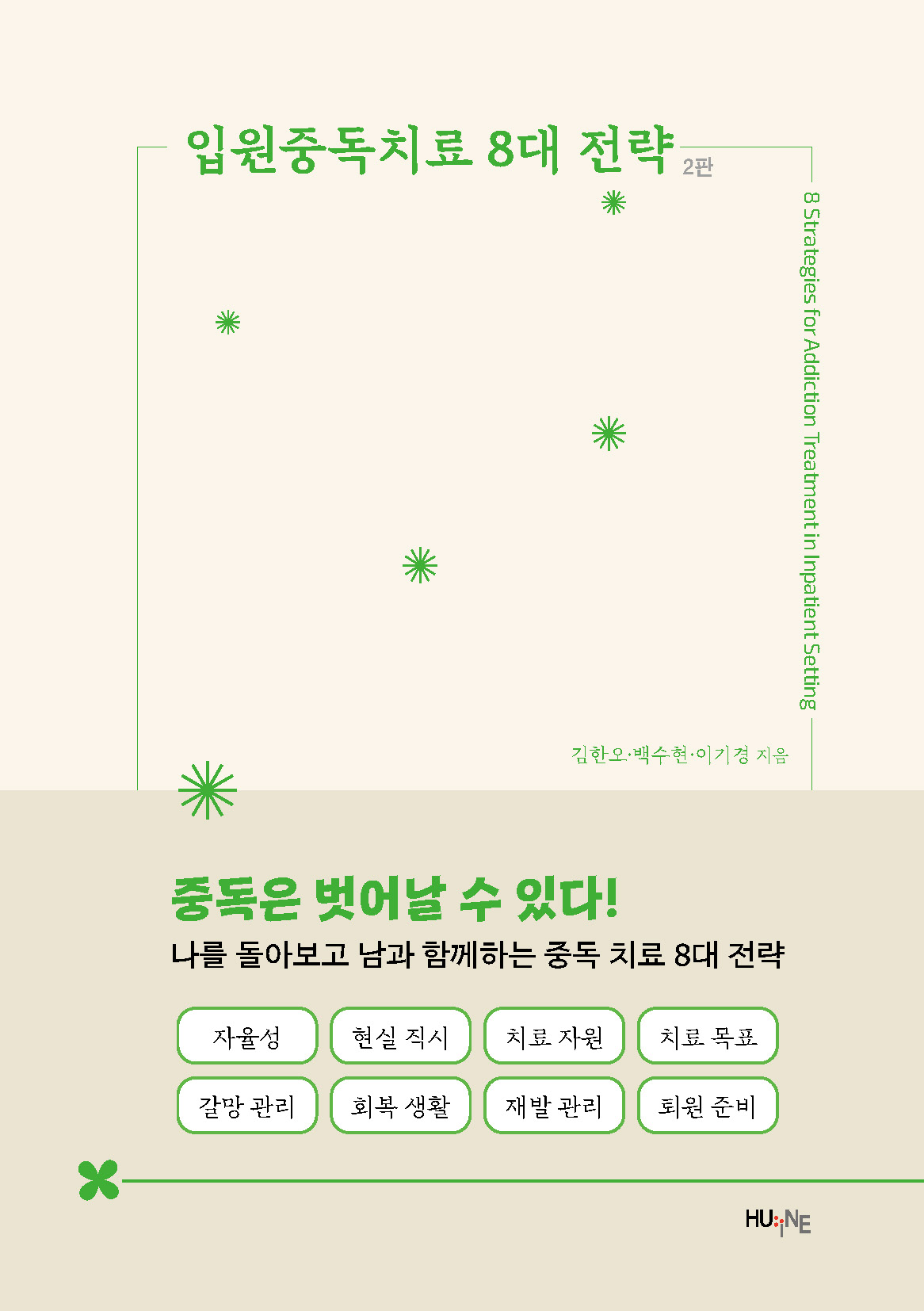 이 책은 실제 현장에서 중독 환자를 보살피는 중독전문의들이 중독에서 벗어나는 길을 고민한 끝에 탄생한 중독치료 지침서다. 중독 회복의 핵심을 여덟 가지 전략으로 체계화한 이 책은 0장 총론에서 입원생활 전반과 치료 자세를 안내한 후 8개의 단계별 전략을 제시한다. 각 전략은 2~10개의 실천 항목으로 세분화되어 있으며, 일지 쓰기, 퇴원 계획 수립, 스마트폰 사용법, 중독 서적 읽기, 놀이·운동·청소 등 일상 습관까지 폭넓게 다룸으로써 환자의 참여를 유도하고 지속적인 동기를 부여한다. 특히 이번 2판은 기존에 저자들이 병동에서 제작하여 사용하던 초판을 실제 병동 환자들의 반응과 치료자의 현장 경험을 반영하여 확대 개정하였으며, 환자 중심의 집단치료에 최적화된 구성으로 병원 안팎 어디서나 활용 가능한 실전 지침서이다.