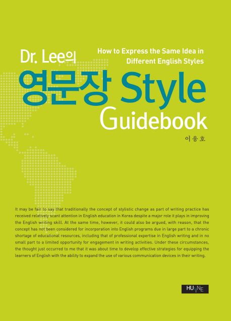 우리는 흔히 “영어 표현력이 좋다”, “영어 표현력이 부족하다”란 말을 하는데, 도대체 표현력이 무엇인가? 체계기능언어학의 창시자로 유명한 마이클 핼러데이는 문법은유란 개념을 설명하면서 우리가 인지하는 세상 경험을 표현하는 방법은 매우 다양하다는 점을 강조한다. 우리말에 비하여 영어가 특히 그러하다. 우리가 보통 동사로 생각하는 것을 영어에선 명사, 형용사, 전치사로 표현할 수 있으며, 절로 표현하는 것을 줄여서 구로 표현하기도 하고, 접속사로 표현하는 것을 동사로 표현하기도 한다. “표현력이 좋다”는 말은 어떤 한 가지 품사, 구, 또는 방식에 얽매이지 않고 문맥, 장르, 스타일 등 다양한 필요에 따라 하나의 의미를 다양하게 표현할 수 있는 능력을 일컫는다. 영어를 잘하는 사람은 같은 말을 동사로도 표현하고, 형용사로 표현하고, 구로도 표현하고, 절로도 표현할 수 있는 사람이다. 이응호 교수님의 저서 『Dr. Lee의 영문장 스타일 가이드북』은 이런 표현력이 왜 중요한지, 그리고 어떻게 하면 표현력을 향상시킬 수 있는지에 대한 명쾌한 답을 제시하고 있다. 본 저서는 “말 바꿔 말하기(paraphrasing)”를 통해서 신문, 잡지 등에서 접하는 영어 문어 표현들이 어떻게 다양하게 재구성되고 재표현될 수 있는 가를 보여줌으로써 표현력 향상의 좋은 길잡이가 될 수 있을 것이다.